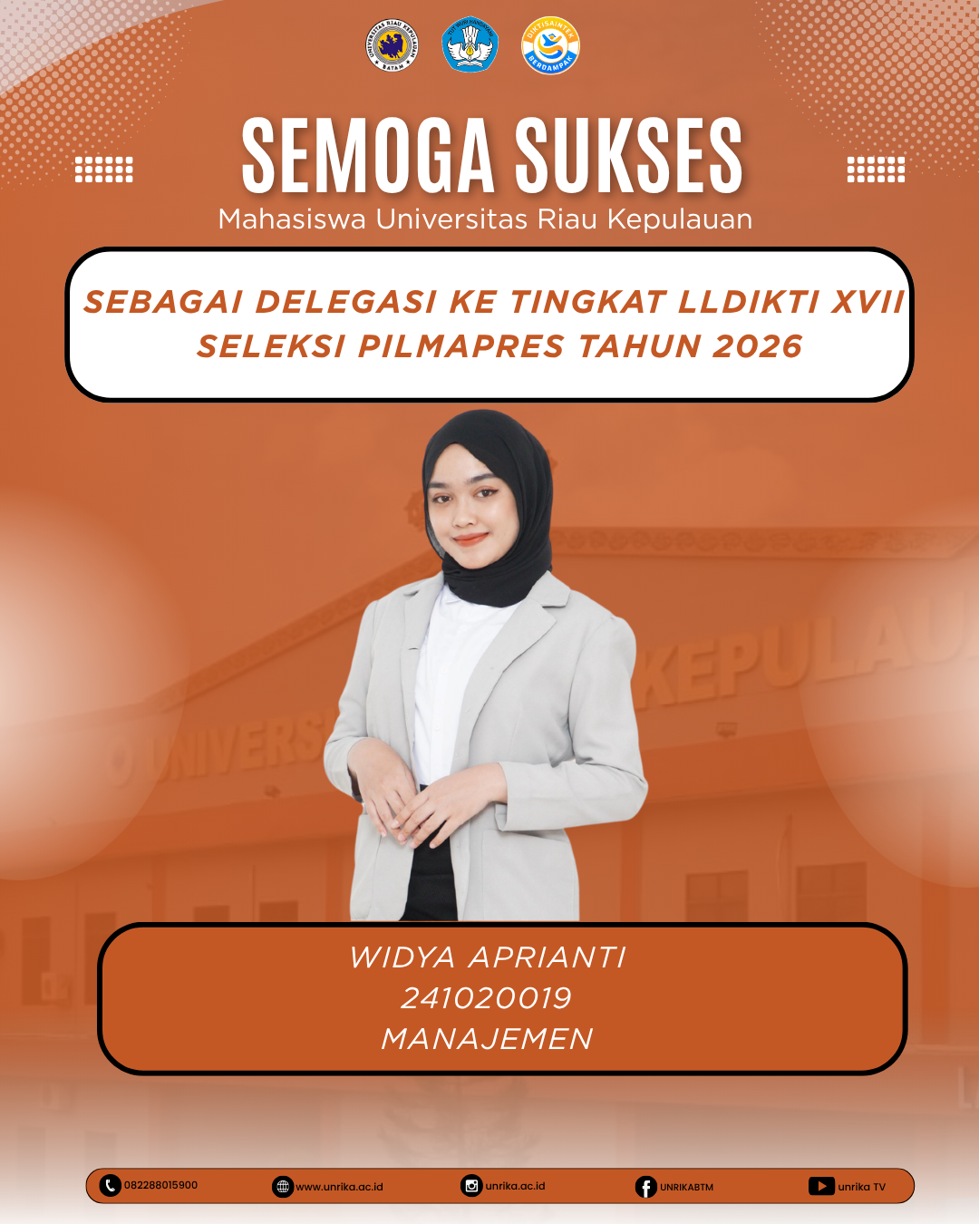 Universitas Riau Kepulauan mengucapkan semoga sukses kepada Widya Aprianti (Manajemen) sebagai delegasi dalam Seleksi PILMAPRES Tingkat LLDIKTI Wilayah XVII Tahun 2026.