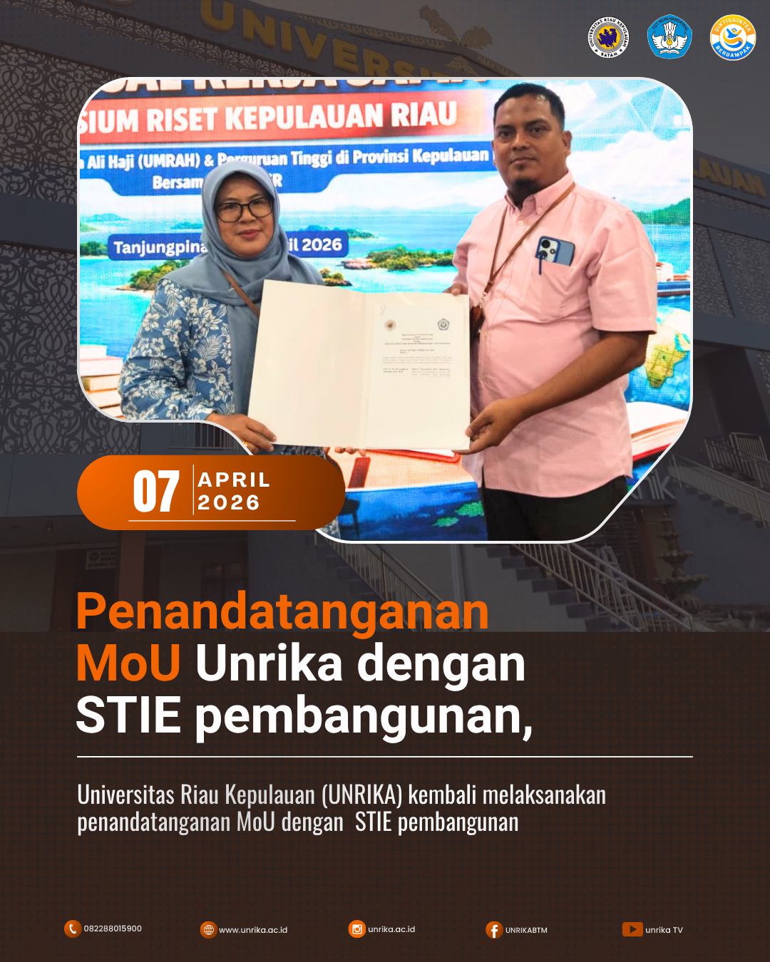 Universitas Riau Kepulauan (UNRIKA) terus memperluas jejaring kerja sama dengan berbagai institusi pendidikan tinggi melalui penandatanganan Memorandum of Understanding (MoU) bersama Sekolah Tinggi Ilmu Ekonomi (STIE) Pembangunan.